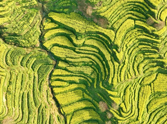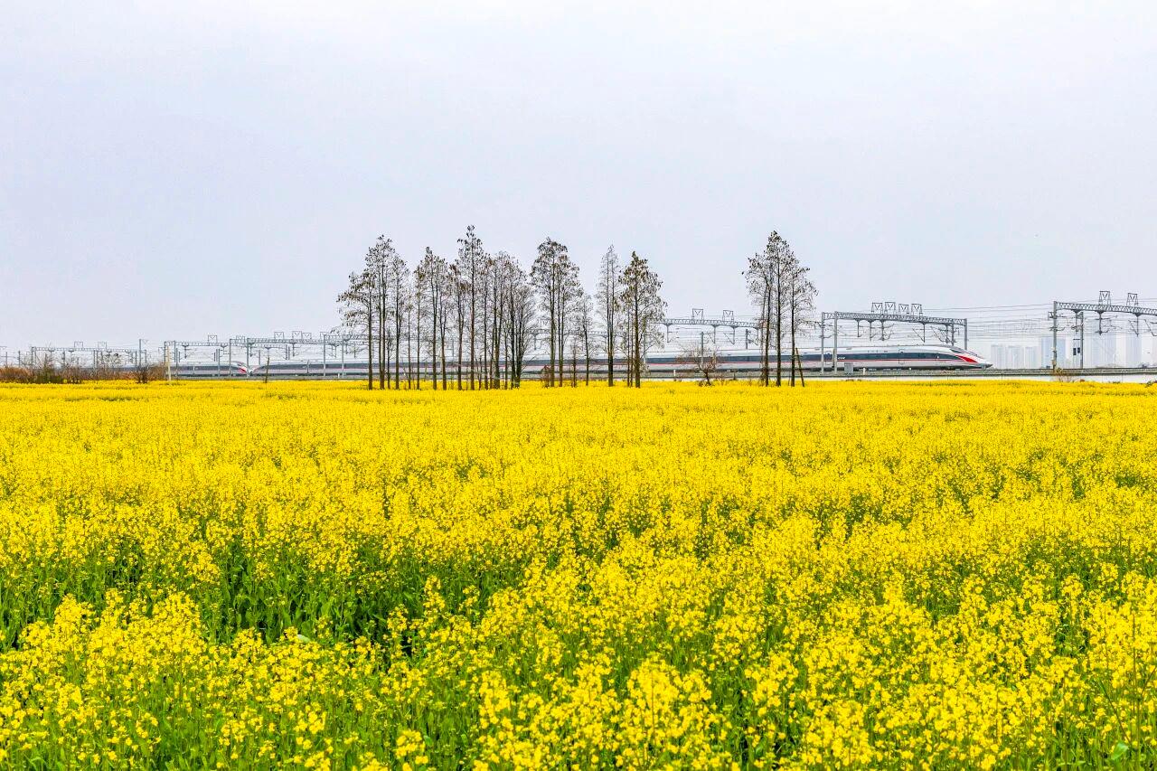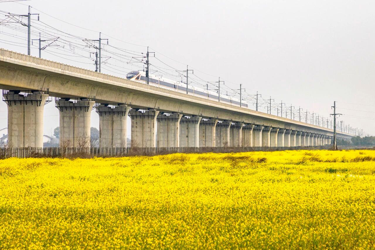 △高铁列车、油菜花田与水网村落交织成画。