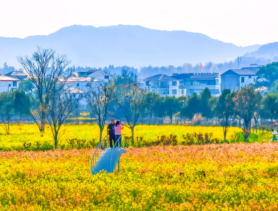 △列车驶出浮梁东站,线路旁五彩油菜花盛开,宛如油画。