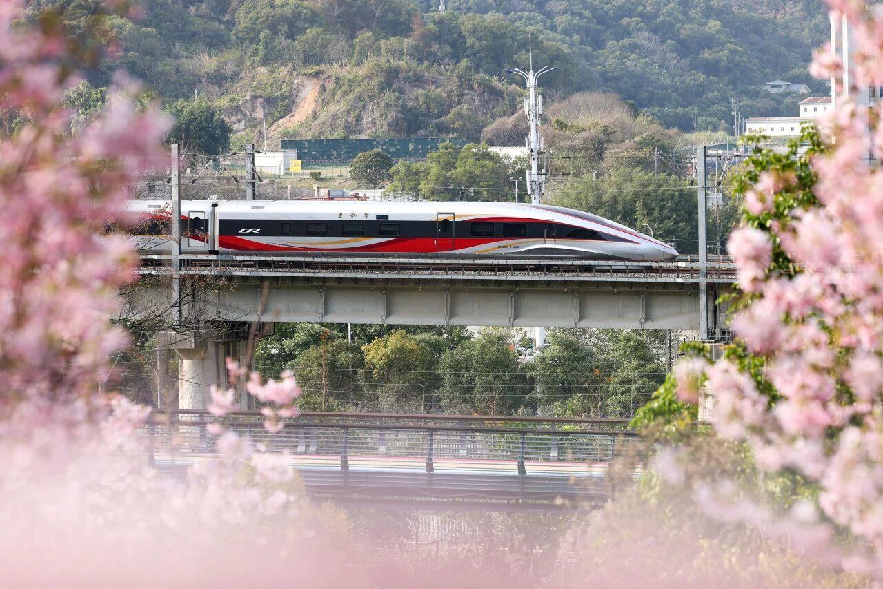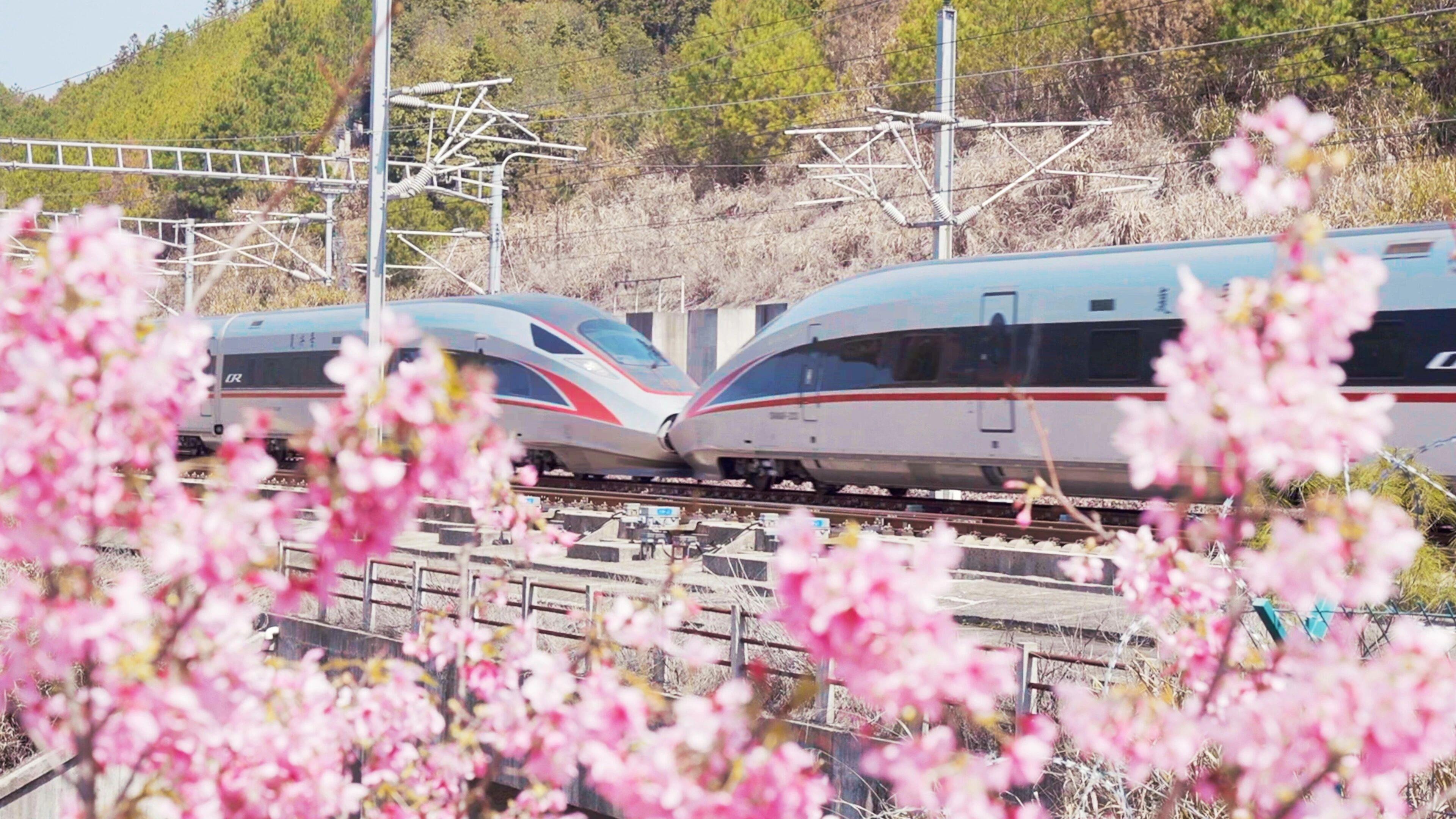 △复兴号驶过合福高铁武夷山北站旁的樱花林。
